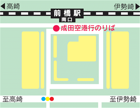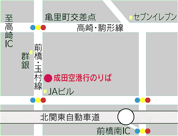 前橋関越交通営業所・JR前橋駅南口・前橋亀里パーキング・JR高崎駅東口・藤岡インター~「東京ディズニーランド®」(一部便のみ)・成田空港第3PTB・成田空港第2PTB(3F出発ロビー)・成田空港第1PTB(4F出発ロビー) |